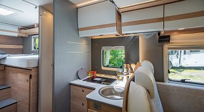 Im Wohnbereich erzeugen Filzverkleidungen und indirekte Beleuchtung eine angenehme Atmosphäre, während die Dekore einen eleganten Eindruck vermitteln. USB-Ladestationen und durchdachter Stauraum optimieren die Funktionalität im Wohnbereich und auch vor der Küche machten die Ideen der CamperInnen nicht Halt: Abhängig vom Grundriss ist die Küche im neuen Cruiser mit einem halbhohen Geräteschrank mit Auszug ausgestattet, der Platz für Kaffeemaschine und Toaster inklusive der notwenigen Steckdosen bietet.