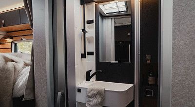 Der vollintegrierte Liner fährt auf einer Tandemachse, bietet mit einem 40 cm kürzeren Radstand als der Arto 88 im Vergleich aber mehr Dynamik und Wendigkeit. Gleichzeitig ermöglicht das zulässige Gesamtgewicht von 5,5 t höhere Zuladungen. Ein wichtiger Kundenwunsch für den Arto 84 war die Integration eines Raumbads: So kann der Toiletten- und Waschraum auf der Beifahrerseite als abgeschlossener Bereich genutzt werden. Die dazugehörige Tür kann aber auch quer zur Fahrtrichtung angeschlagen werden, so dass ein vom Wohnraum komplett separiertes Raumbad entsteht, das auch die komfortable Regendusche inklusive der bodentiefen Saloon-Duschtür aus Echtglas auf der Fahrerseite umfasst.