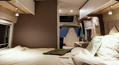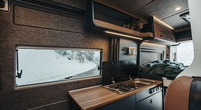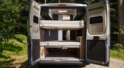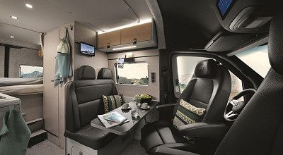 Für die Alltagstauglichkeit sorgt auch der multifunktionale und variable Vollausbau im Inneren, der einige Neuerungen und raffinierte Detaillösungen aufweist. So beinhaltet das überarbeitete Möbelkonzept des EXPLR Schiebetüren statt Klappen für die Möbelfächer, die mit dimmbarer Ambientebeleuchtung ausgestattet sind. Die Sitzgruppe des EXPLR ist dank selbstverriegelnden Rollen leicht verschiebbar und sicher arretierbar. Darüber hinaus wurde das direkt hinter der Sitzgruppe hochklappbare Flexboard der Bettverlängerung weiter nach oben versetzt, um mehr Stauraum und Ladehöhe im Kofferraum zu schaffen.