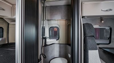 Direkt hinter dem Wohnbereich schließt sich bei allen Globetrail Active-Grundrissen ein platzsparendes Schwenkbad an. Im normalen Gebrauch schmiegt sich die Schwenkwand an die Fahrzeugaußenwand, wobei das Waschbecken bequem zugänglich ist. Wird die einrastbare Schwenkwand über die Toilette gedreht, entsteht quasi eine separate Duschkabine.