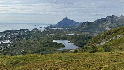 In Svolvaer angekommen habe ich dann den sehr ! mühsamen Aufstieg zum Tjerebergtinden auf mich genommen, um ein paar schöne Bilder zu machen. Das Wetter soll umschlagen und da bleibt nicht viel Zeit zum Überlegen. Die Tour habe ich wieder von Komoot. Insgesamt sind es 11 km vom Stellplatz hin und zurück. Dazu kommen noch rund 400 Höhenmeter, die man überwinden muss. Es geht teilweise um die 40 Grad steil auf steinigen und Geröllwegen hinauf. Oben angekommenhat man allerdings einen überwältigenden Blick auf Svolvaer und Kabelvag. Man ist gut 4 Stunden unterwegs.