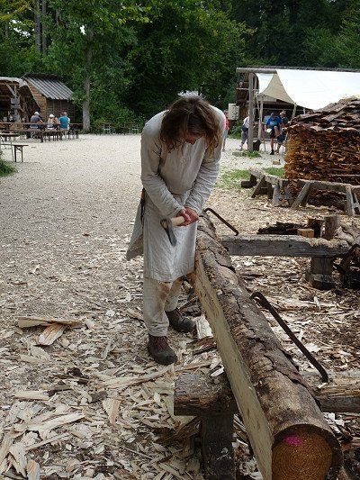 Bauen wie zur Karolingerzeit! Keine Sägemaschine, keine Holzbearbeitungsmaschinen. Alles wird von Hand gefertigt nach Methoden aus dem 9. Jahrhundert.
