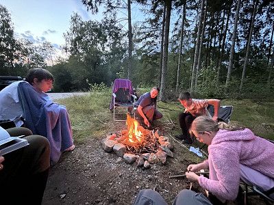 We staan aan een zwemmeertje in het bos. Heerlijk kampvuurplaatsje voor de camper.