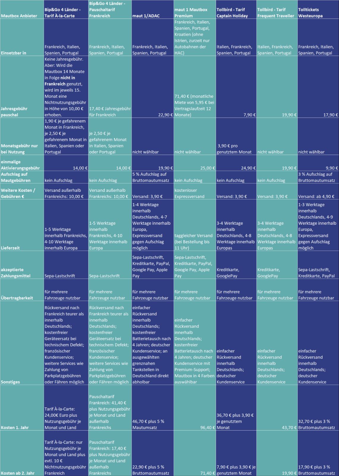 Für manche Länder gibt es mittlerweile aber Mautboxen, die länderübergreifend eingesetzt werden können. Dazu gehören Frankreich, Spanien, Portugal und Italien. Für Kroatien gibt es aktuell massive Einschränkungen, sodass Mautbox-Anbieter wie maut1/ADAC die Nutzung in Kroatien im Herbst 2024 mit der Standard-Mautbox wieder abgeschafft haben. Es wird erwartet, dass mit der Umstellung auf die digitale Maut in Kroatien im Herbst/Winter 2026 auch eine Kompatibilität mit gängigen Mautboxen entstehen wird. Im deutschsprachigen Raum weit verbreitete Anbieter dieser 4-Länder-Mautboxen sind Bip&Go, maut 1/ADAC, Tolltickets Westeuropa und noch relativ neu der Anbieter Tollbird. Ganz neu dabei ist seit Sommer 2025 auch die Premium Mautbox von maut1, die auch in Teilen von Kroatien einsetzbar ist. Freeontour stellt die Mautboxen dieser Anbieter im Folgenden in alphabetischer Reihenfolge vor und vergleicht das Preis-Leistungs-Verhältnis*.