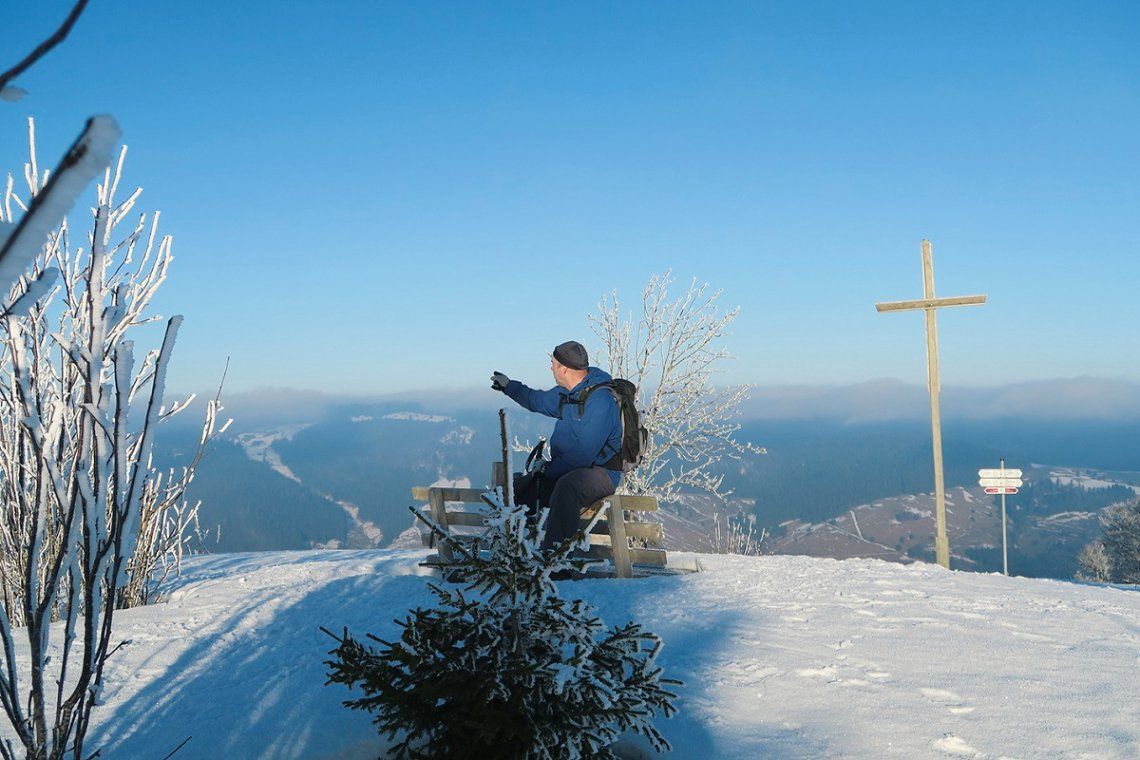 Vom Parkplatz in Innerlehen (1) wandern wir kurz auf der Straße nach Süden und legen am Ortsrand die Schneeschuhe an. Am Friedhof vorbei gehen wir über offene Wiesen oder folgen dem parallel verlaufenden Winterwanderweg. Nach knapp 2 km weist die Markierung rechts hinauf. Über Forstwege wird das Präger Eck (2), 1095 m, gewonnen. Wir halten uns rechts und steigen noch kurz auf einem breiten Weg weiter hinauf. Bald jedoch biegen wir links über einen schmalen Steig in die Waldquerung ein. Der Westweg leitet uns schließlich zum großen Gipfelkreuz auf dem Blößling (3). Oft können wir hier neben tollen Fernblicken im Vergleich zu den bekannteren Gipfeln noch echte Bergeinsamkeit genießen.