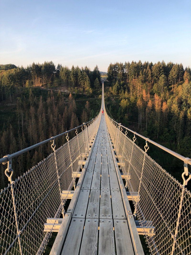 Toller Stellplatz ca. 30 Gehminuten von der Hängebrücke entfernt, in Coronazeiten ab 11 Uhr nur immer für 1 Stunde von der jeweiligen Seite betretbar, am besten frühmorgens hingehen ( wir waren um 8 Uhr dort und es waren etwa 10 Leute auf der Brücke)