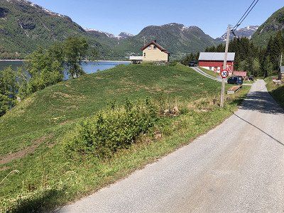 Vanaf Kjornes camping loopt een fietspad naar Sogndal. We fietsen naar het haventje en moeten daar een stukje lopen. Voorbij Sogndal gaat het fietspad verder langs de Rv13. Als de hoofdweg een tunnel in gaat, rijden wij op de oude weg nog een stukje verder tot de fietsroute aansluit op de Rv13. We rijden dezelfde route weer terug.