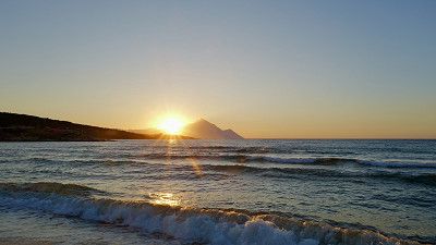 Wir genießen den Sonnenuntergang und den Blick auf den Golf von Korinth und sitzen hier bis in die Nacht.