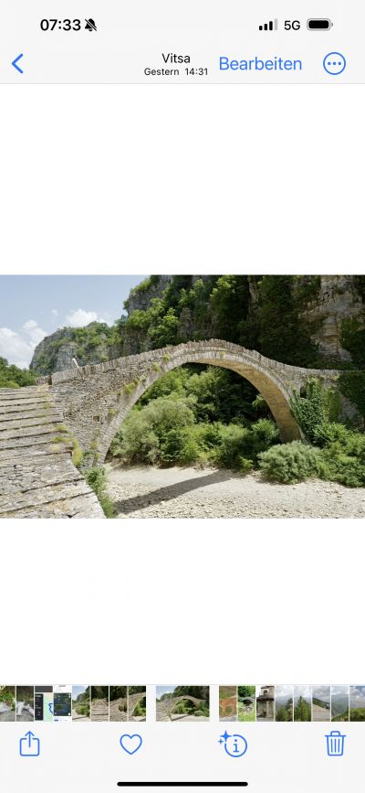 Zunächst kommen wir an der sehr gut erhalten und beeindruckenden Steinbrücke in Misiou vorbei.