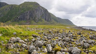 Von hier aus kann man Richtung Unstad wandern (4,5 km) vorbei an riesigen Felswänden und immer am Nordatlantik entlang. Auf dem Weg kommt man an einer Statue des Künstlers Markus Raetz vorbei. Bei näherem Hinsehen entpuppt sich die als Gesicht. Aber je nach Richtung, aus der man schaut, sieht das anders aus. Unweit davon steht ein Gedenkstein "Joe 1934".