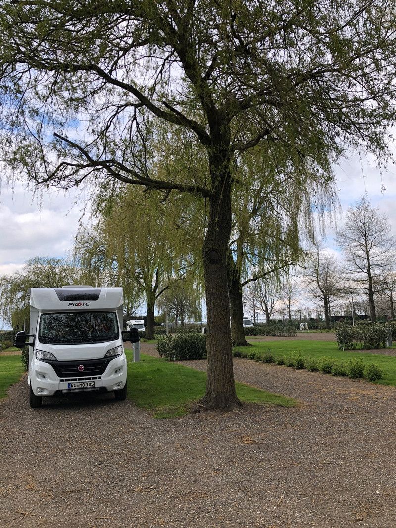 Sehr gepflegt und sauber. Gekieste Stellfläche mit zusätzlich Rasenfläche. Auch für größere Fahrzeuge.
