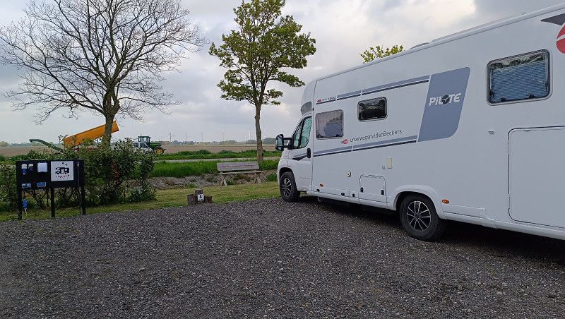 Der Stellplatz an der Tulpengärtnerei ist einfach. 6 Plätze auf Schotter vorne an der Straße, weitere hinter dem Firmengelände. Strom, Wasser, Entsorgung, Dusche, WC, Picknickbank vorhanden