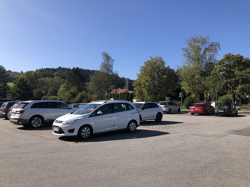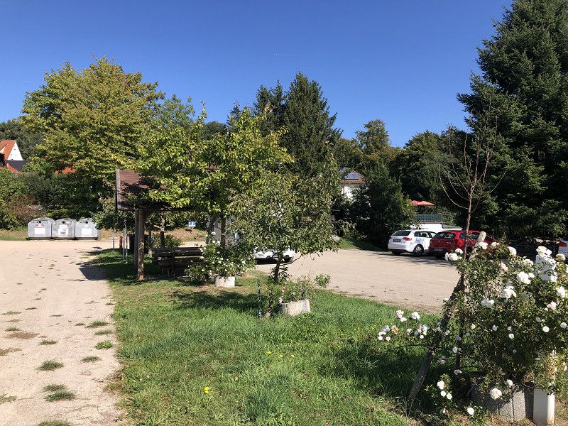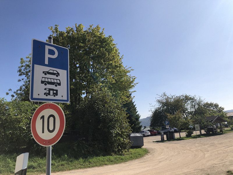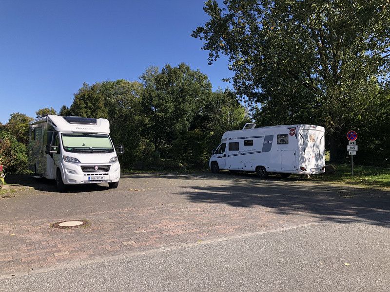 Auf einem für PKWs kostenfreien Parkplatz liegt der für Wohnmobile kostenpflichtige Stellplatz. Leider bei unserem Besuch von Autos zugeparkt, da die Plätze im Schatten liegen.