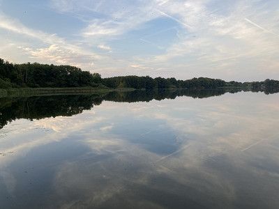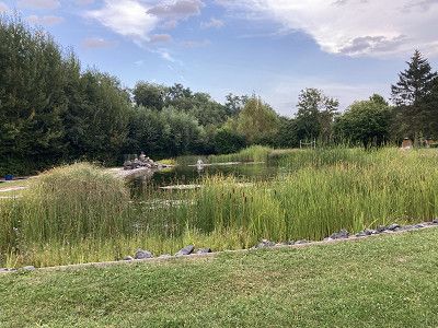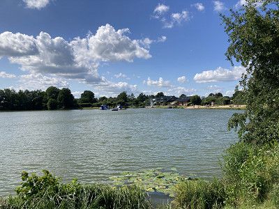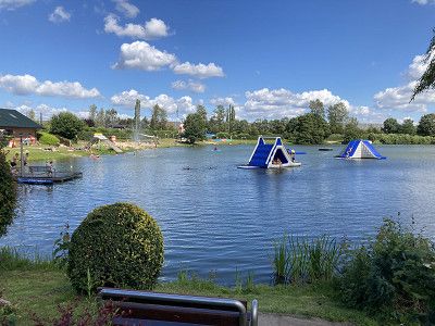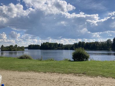 Der See (etwa 300 m entfernt) hat einen Holzsteg und einen kleinen sandigen Bereich um ins Wasser zu gelangen.