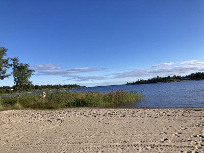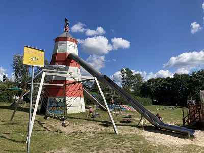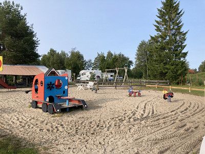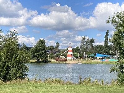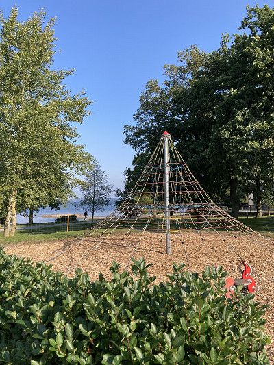 Ein Sandstrand läd zum Baden ein und auch an die kleinen Gäste wurde gedacht. Ein schön gestalteter Spielplatz 🛝 ist vorhanden.