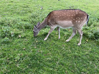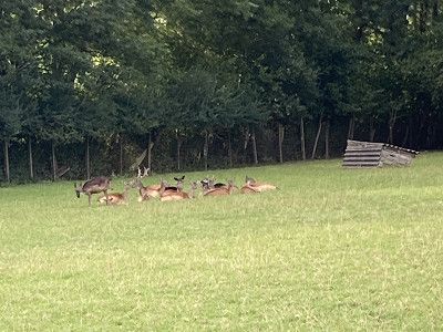 Wir hatten einen wunderschönen großen Wiesenplatz und konnten direkt auf das angrenzende Gehege mit reichlich Damwild schauen.