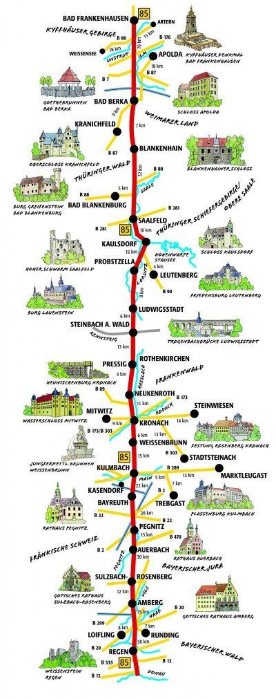 Eingebettet in die unverfälschte Landschaft reizvoller Naturparks, entlang romantischer Flüsse und Täler, erleben Sie ein Stück der Geschichte Deutschlands. Als Zeitzeugen vergangener Epochen vermitteln trutzige Burgen, liebevoll restaurierte Schlösser und bedeutsame Ruinen entlang der B 85 vom Kyffhäusergebirge bis in den Bayerischen Wald Geschichte zum Anfassen. Begeben Sie sich mit Ihrem Wohnmobil auf einen Streifzug der Bier- und Burgenstraße.