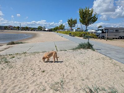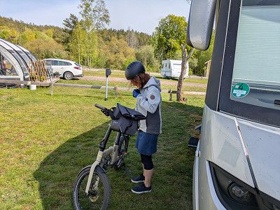 Zum Mittag sitzen wir in der Sonne. Lotta schläft entspannt im Wohnmobil und wir packen die Fahrräder aus der Heckgarage und radeln in die Stadt. Auf dem Rückweg kaufen wir bei LIDL noch Wasser und etwas Lebensmittel ein.