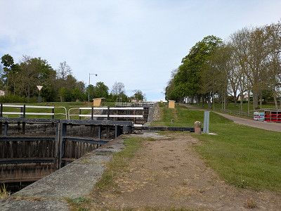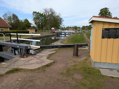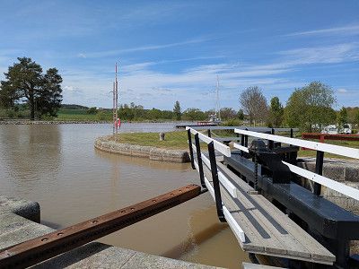 Schließlich fahren wir dann doch den teureren Stellplatz an einer Schleusen Anlage an. Weil es schon nach 17:00 Uhr ist, bekommen wir natürlich nur noch einen Platz in der 2. Reihe.