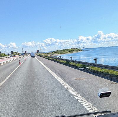 Da hier im Segelclub das Wasser nichts kostet machen wir den Tank noch einmal voll und dann geht es auch schon wieder los. Während Carmen fährt nutze ich die Gelegenheit und befrage noch einmal das Internet. Tatsächlich dürfen wir in Dänemark auf Autobahnen 100km/h schnell fahren, statt nur 80km/h wie wir dachten. Also schnell den Tempomat auf 103 eingestellt und die Brücken rücken etwas näher.