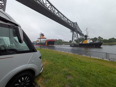 Die Schwebefähre ist mal wieder kaputt und fährt nicht, deshalb können wir auch die Kanalseite nicht wechseln.