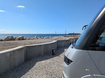 Kurz nach 12:00 Uhr sind wir dann am heutigen Stellplatz in Körsör angekommen. Wir haben einen Platz mit direkter Aussicht auf Ostsee und Brücke und einem kleinen Strand.