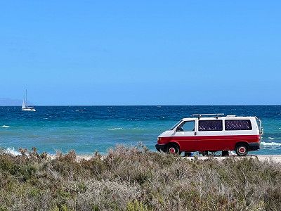 Wir stehen auf dem Área de Autocaravanas de Tarifa (36.0179, -5.6105) für 15€/Nacht. Zum Strand sollen es nur 200m sein. Tarifas Strände – ein absoluter Traum. Feiner, heller Sand trifft auf türkisblaues Wasser und das Ganze mit einer ordentlichen Prise Wind, ein Paradies für Kitesurfer. Egal ob man chillen, durch die Dünen spazieren oder einfach mit einem kalten Drink aufs Meer starren will, hier findet jeder seinen Spot. Und: An klaren Tagen kann man rüber nach Afrika schauen.