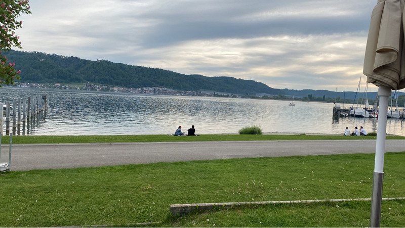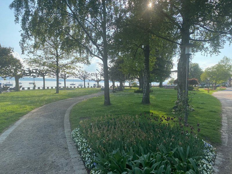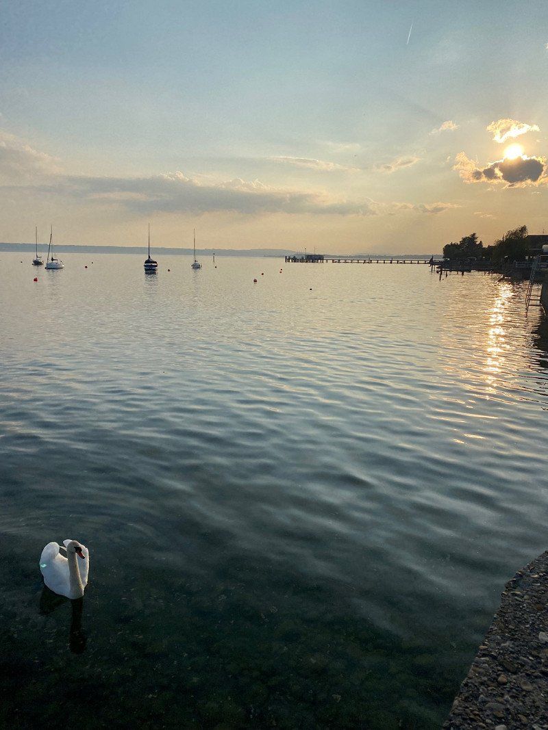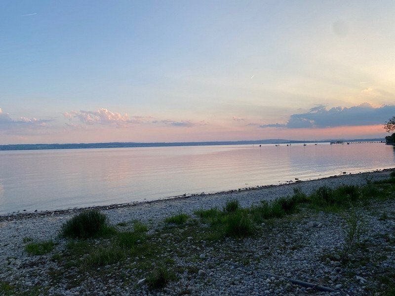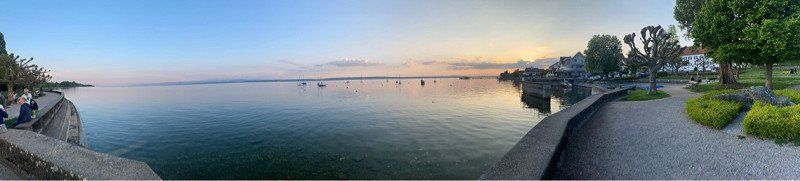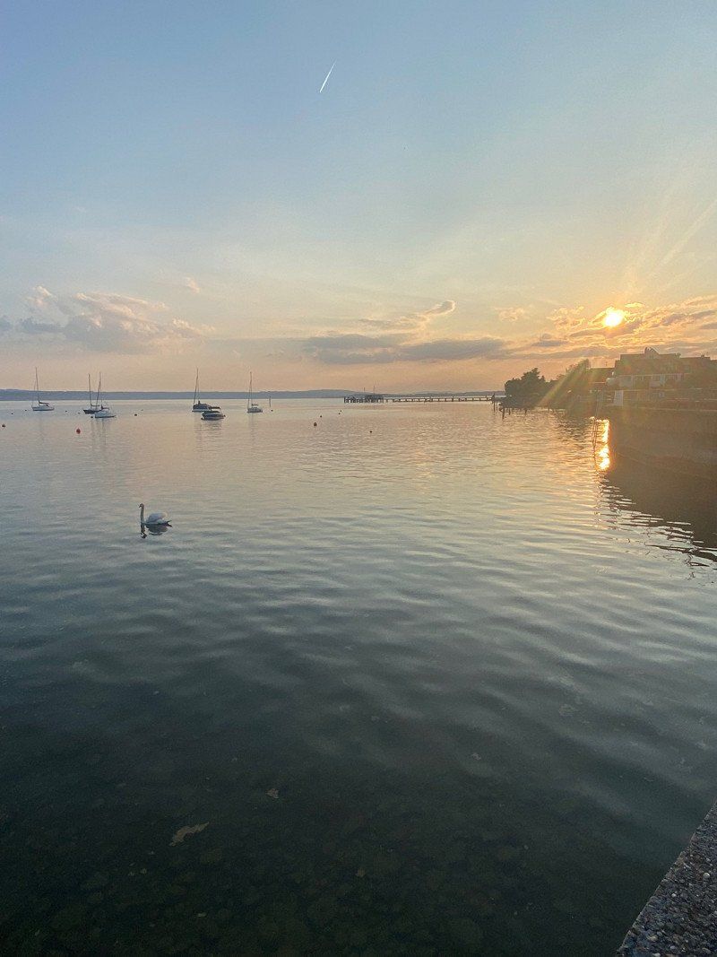 Hagnau ist ein süßes Städtchen und vor allem auf der Mauer im Park ist die Aussicht gigantisch. Wir haben uns eine Pizza geholt und den Sonnenuntergang genossen.