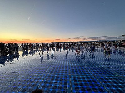 Als die Sonne dann untergegangen war haben wir uns ins Getümmel gestürzt vor dem „Gruß an die Sonne“- wirklich ein tolles Kunstwerk das leider nur wahnsinnig überfüllt war zu der Zeit als es sein Lichterspiel beginnt. Der riesige Kreis aus Solarzellen ist wirklich sehr sehenswert aber war doch etwas extrem überlaufen sodass wir relativ schnell weiter gezogen sind und gemütlich zu unserem Übernachtungsplatz zurück gelaufen sind.
