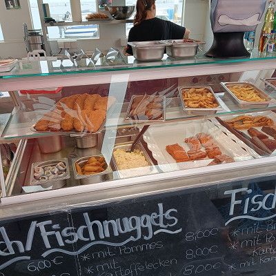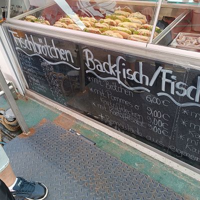 Im Hafen haben wir uns an einer Fischbude leckeren Backfisch gekauft. Wir haben uns den Backfisch einpacken lassen (ohne Brötchen/ war dann 50 Cent günstiger)