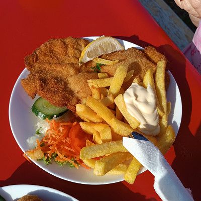 Am Campingplatz gibt es noch eine Pommesbude (Foto Wiener Schnitzel/ 12,90€) und ein kleiner Shop mit guten Brötchen und Kuchen (7.30-10.30 Uhr geöffnet).