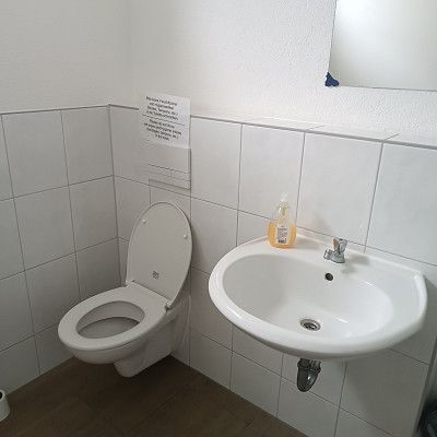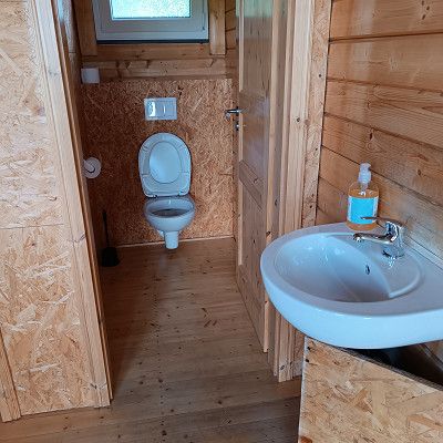 Es gibt noch im grünen Holz-Gartenhaus Nr. 7  zwei Toiletten (1x Damen / 1x Herren), die kostenfrei benutzt werden können (oder die eigene Chemie Toilette).