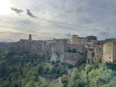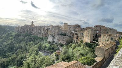 überwältigender Anblick der Altstadt auf dem Tuffstein-Fels in der Abendsonne, einer der schönsten mittelalterlichen Städte der Toscana