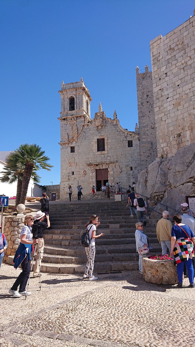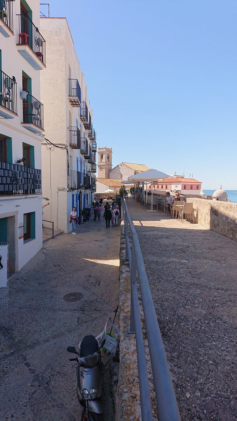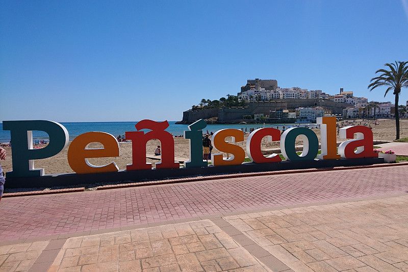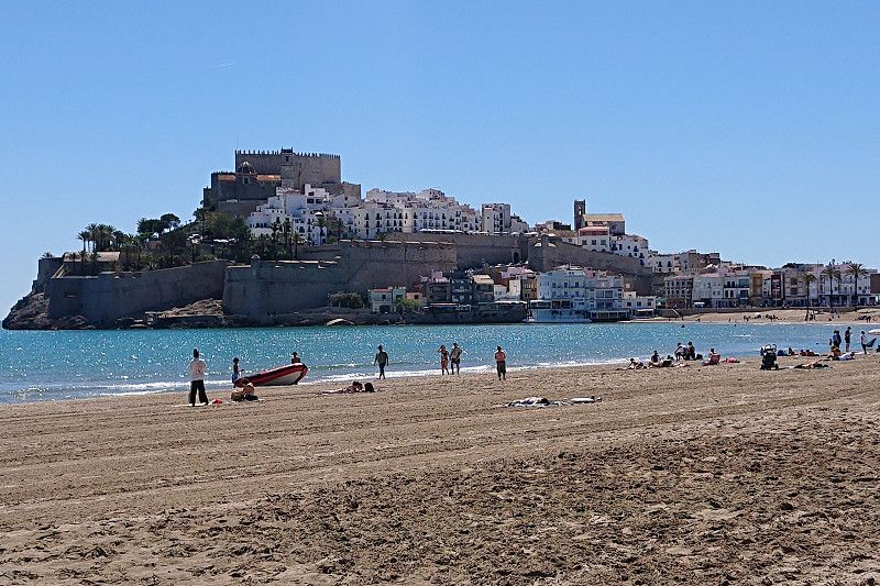 Heute ist endlich schönes Wetter, 25 Grad. Also noch einmal Ferien geniessen. Und wo ginge das besser als - lt. Werbung - in einem der schönsten Ferienorte Spaniens: Peñiscola. Vor der Stadt liegt auf einer Halbinsel das Wahrzeichen: die von den Tempelrittern erbaute Burg umsäumt von schmalen steilen Gassen der Altstadt. Unten zwei kilometerlange Sandstrände und Hotel neben Hotel. Naja.
