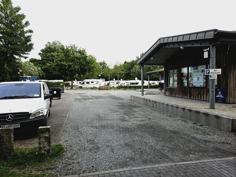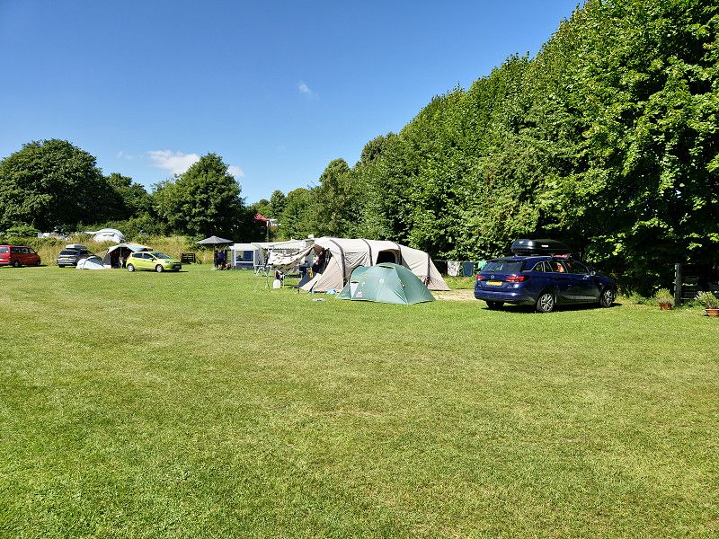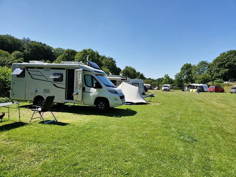 Ein ruhiger Campingplatz, unparzelliert auf Rasen. Modernes Sanitärgebäude