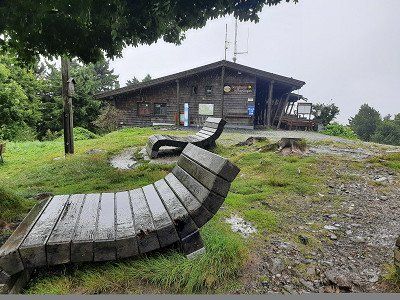 Endlich stehen wir am eigentlichem Dreisessel mit durchnässter Kleidung. Berggasthof Dreisessel (1323m) Trotz Regen bestiegen wir noch den Dreisesselfesen. Die drei steinernen Sessel