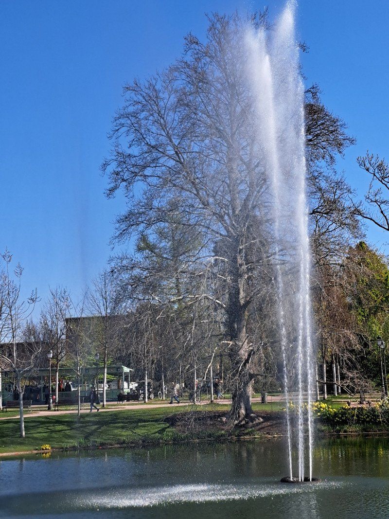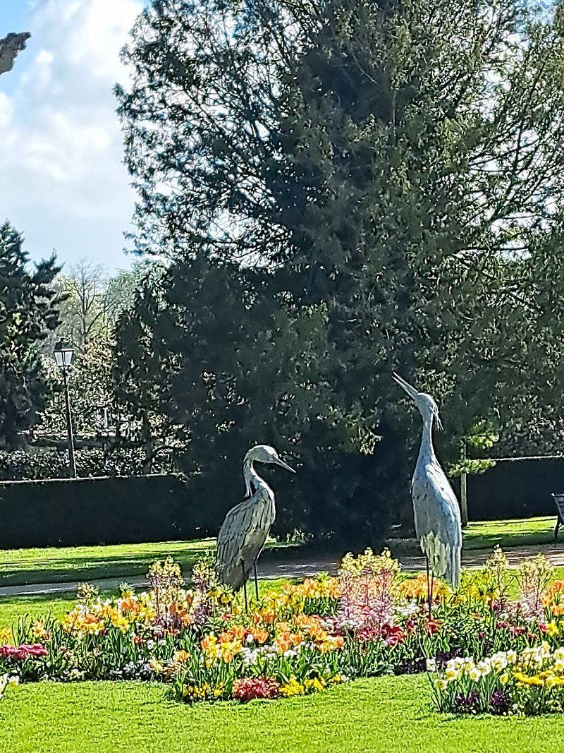 Some storks are nesting on the trees in the orangery. In the center of the park there is a small lake.