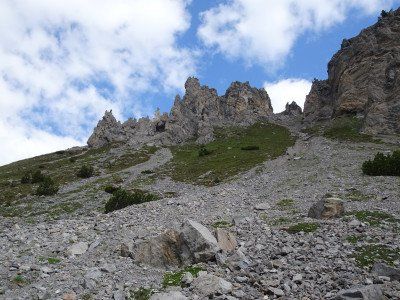 Gleich hinter demHotel steigt der Weg an. Die ersten 100 Meter von gut 20 Kilometern sind geschafft. Entlang von Hängen geht es über einen Pass der Engadiner Dolomiten hinüber zum Val Mora. Bald kommt der letzte "Point of no Return", bei dem man noch nach Buffalora abzweigen und die Route verkürzen könnte. Wir marschieren weiter. Weit unter uns öffnet sich das Val Mora mit seiner Alp. Wir passieren die Alp Mora und die Alp Sprella und tauchen in eines der wildesten und natürlichsten Täler mit einer nicht verbauten Flusslandschaft und Wiesen voller Pionierpflanzen. Aber nicht nur Pflanzen gedeihen hier, auch Murmeltiere erfreuen uns langsam müde werdende Wanderer.