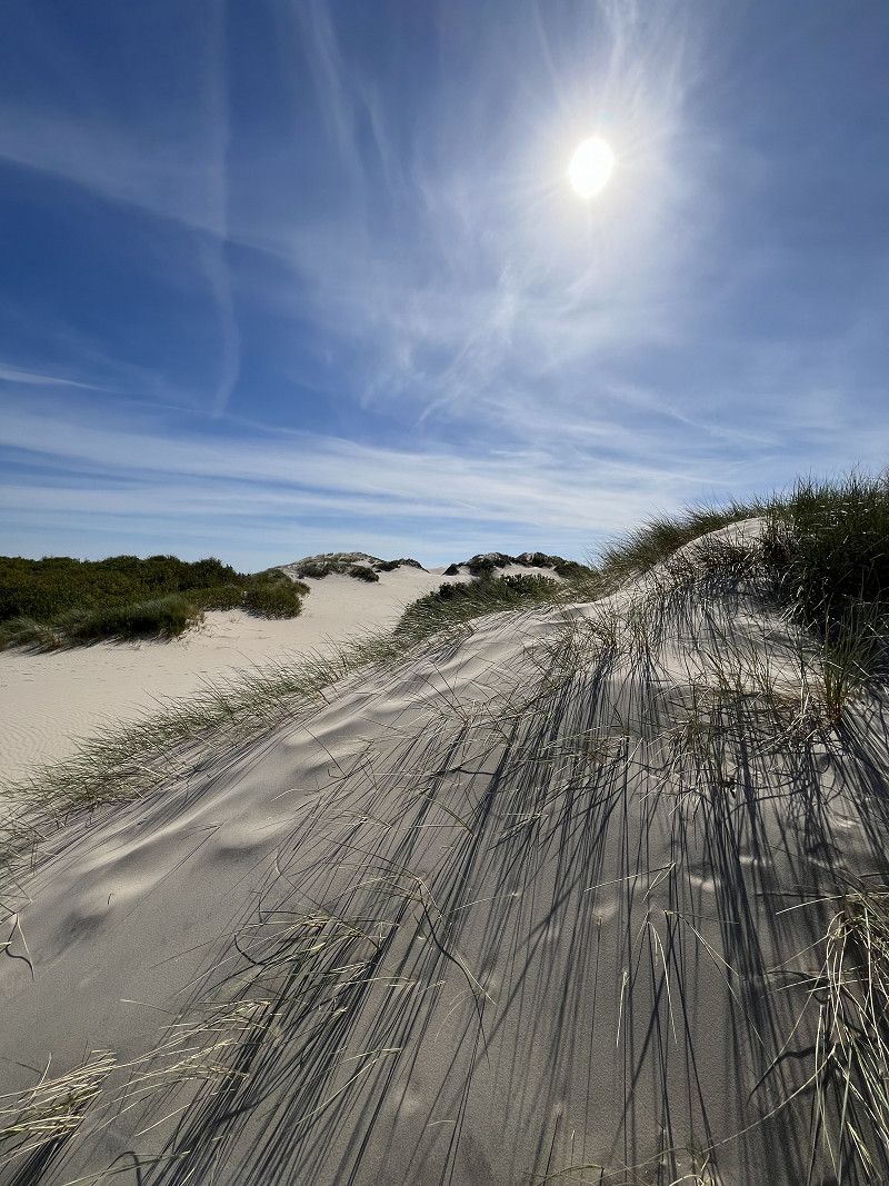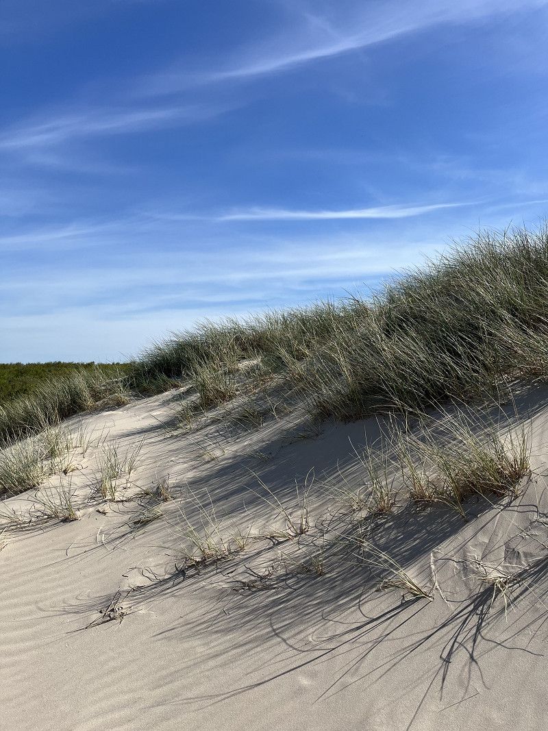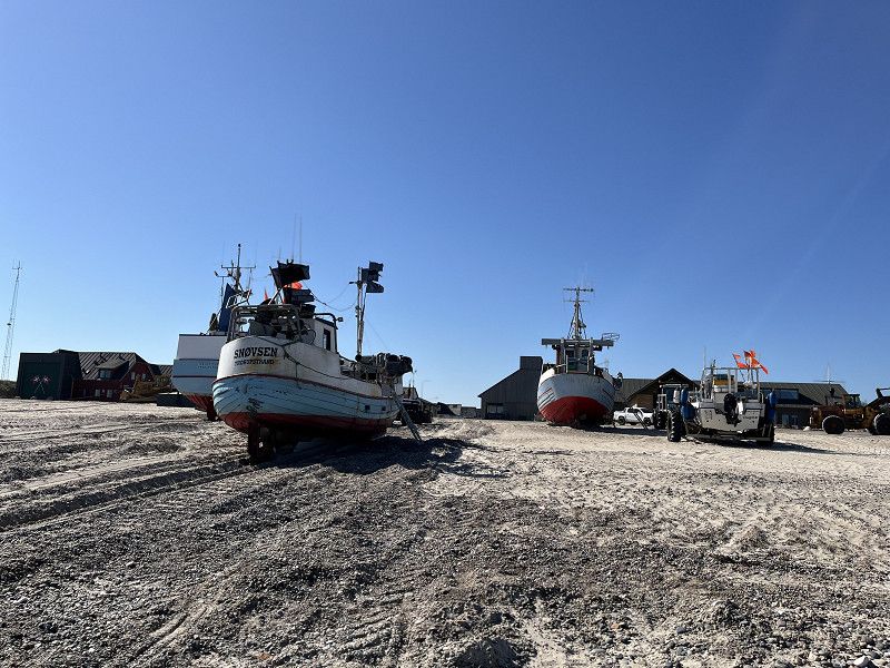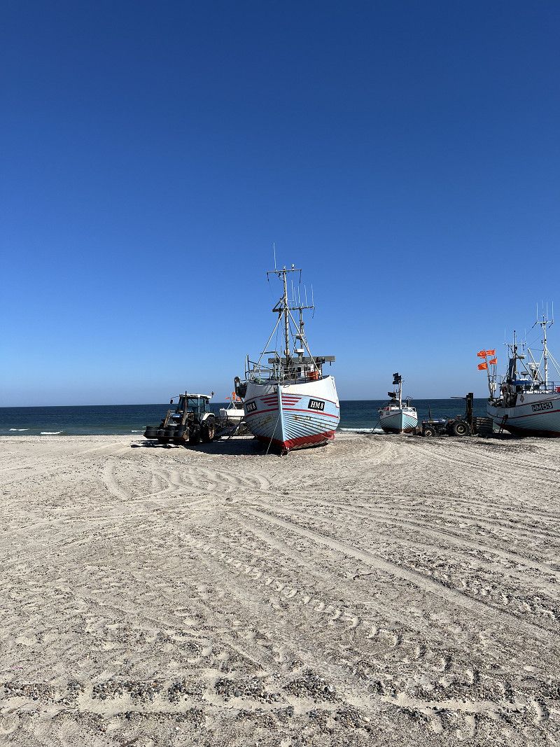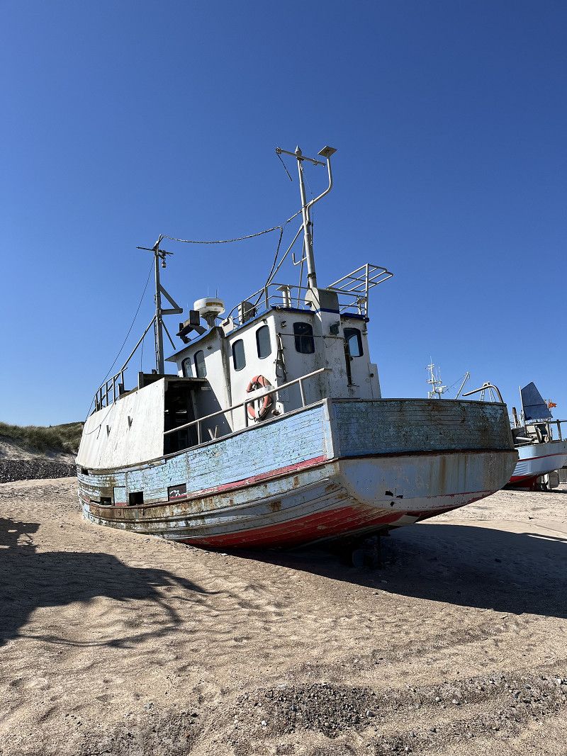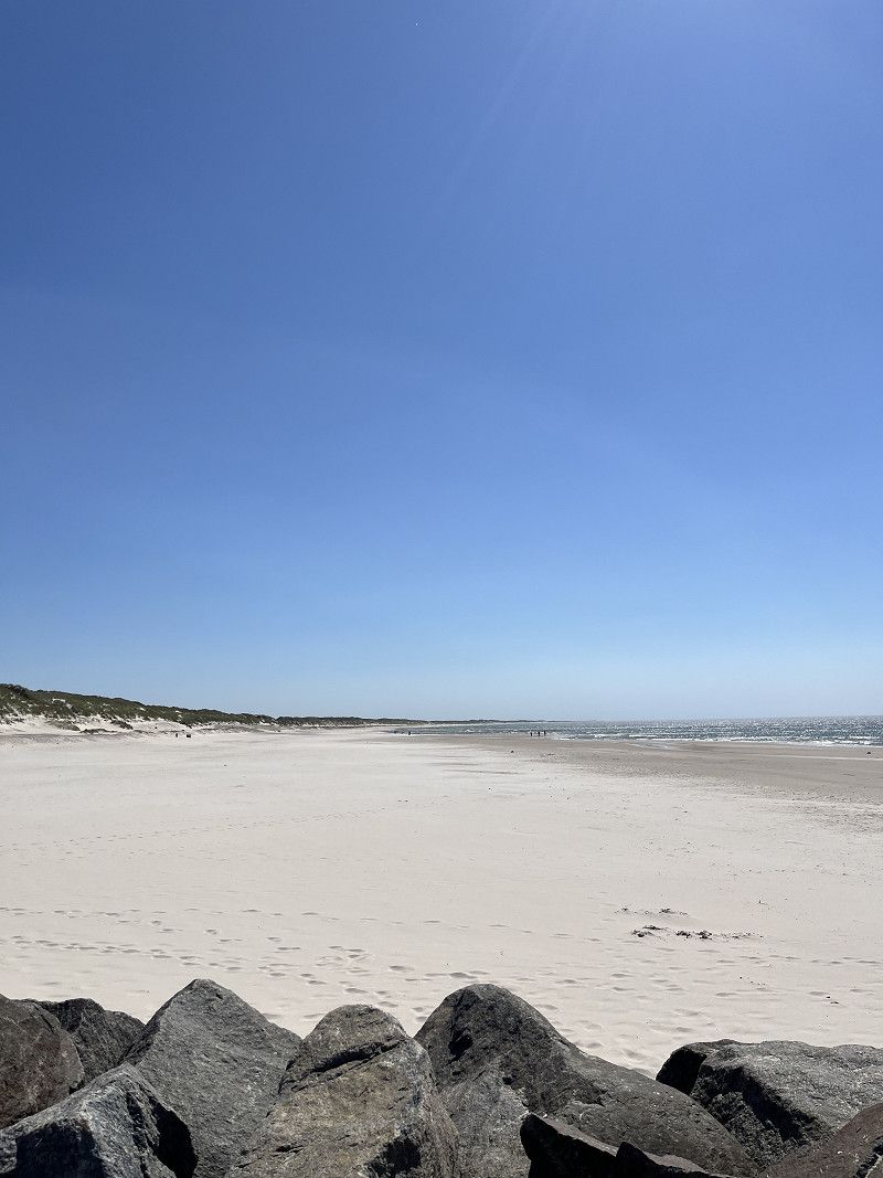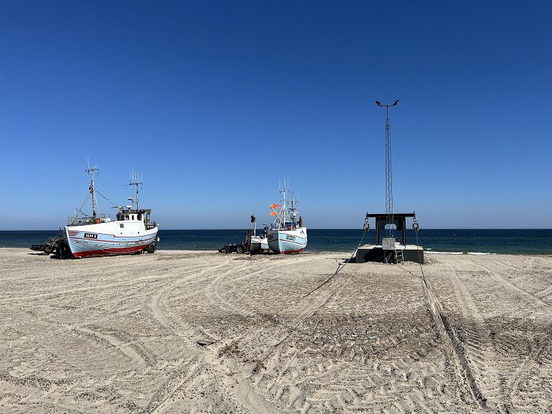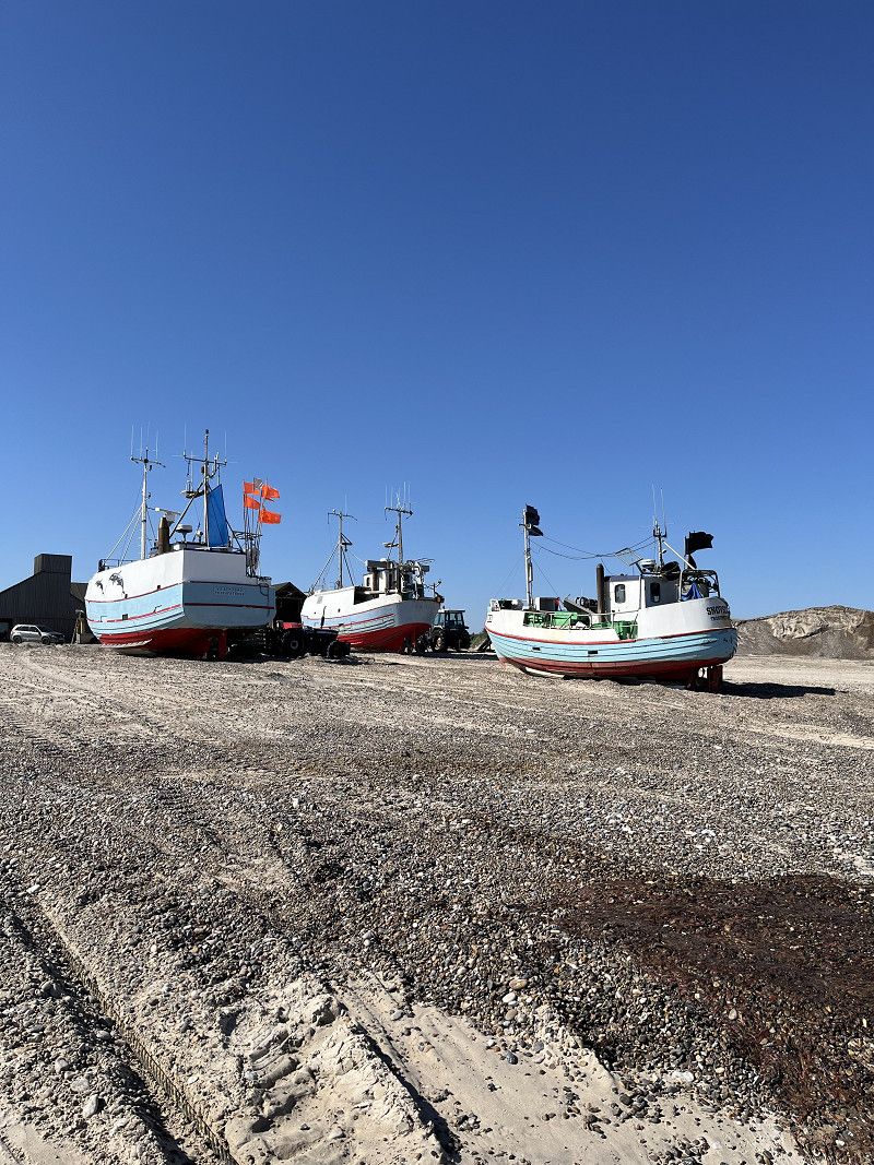 Between Thorup Strand and Blåvand lies Hvide Sande, a popular destination for surfers, kitesurfers and other water sports enthusiasts. There is also a beautiful, almost endless sandy beach. The few beachgoers enjoyed the beautiful but windy weather. The large wind turbines that were built in the middle of the sea also caught our attention. In the harbor of Hvide Sande is "omhu:". This company collects garbage from the sea with the aim of making jewelry, bags, clothes and much more in their workshop (https://www.om-hu.dk/). We couldn't resist and bought ourselves a ring and keychain. After (a short) shopping trip, we ate fish and chips with delicious fish from the North Sea right next door. Then our journey continued to Blåvand.