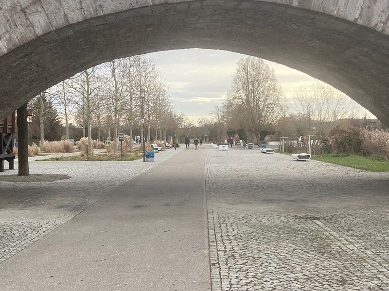 The square at the mouth of the Saale is directly under a busy bridge. The place on the other side of the Main is definitely nicer and the footpath across the Main is bearable. You are always out and about with your dog anyway.