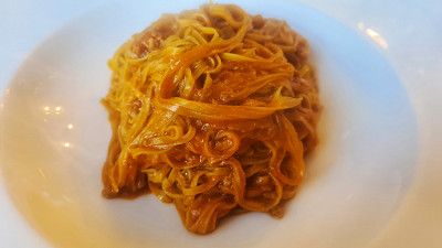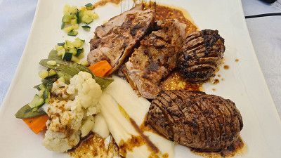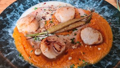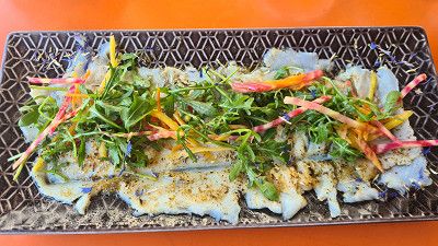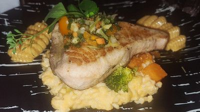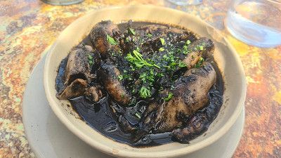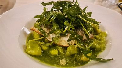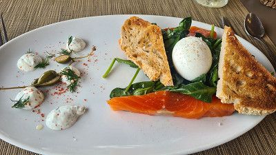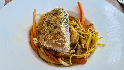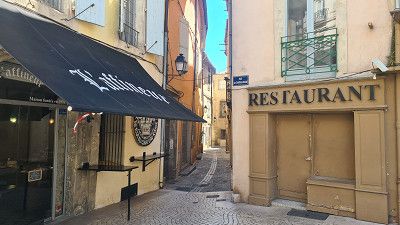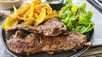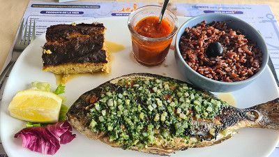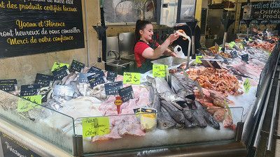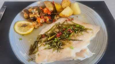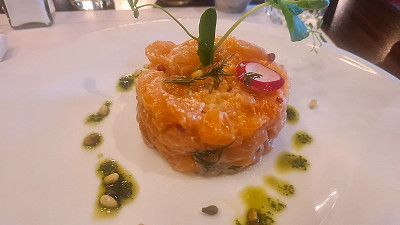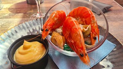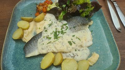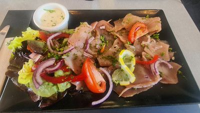 Die Kulinarik. Viele Restaurants haben "nous sont complet" ausgeschildert. Nach längerem Suchen finde ich in der Brasserie La Terrasse einen Platz. Ich bestelle die Hausspezialitäten, erst ein Carpaccio de thon fumé maison und dann Aile de Raie aux Salicornes (6-9). Ich kann mich nicht erinnern, zuletzt ein neues Gericht versucht zu haben, aber Rochenflügel gehört dazu und war den Versuch mehr als wert.