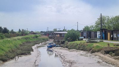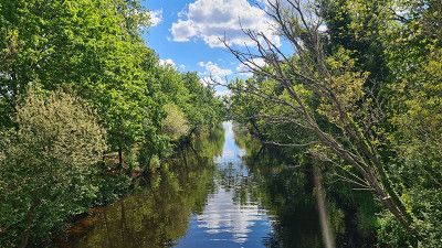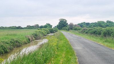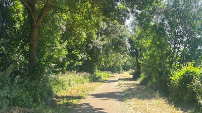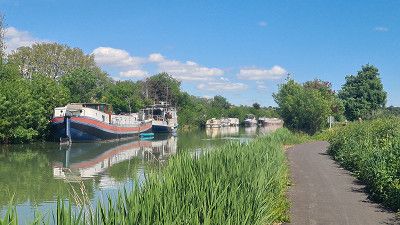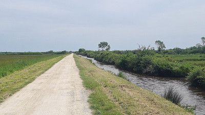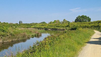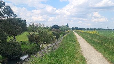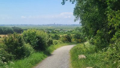 Die Rückfahrt. Auf Radwegen (13) geht es nun vorbei an den Kanälen und Feldern der Marais bis ich wieder nach L'Aiguillon-sur-Mer komme und dort vor dem La Goelette einen letztes Mal für ein Café Glace halte. Gegen vier Uhr deponiere das eBike auf dem Camp und laufe nochmal zu den Dünen der Grand Plage (15).