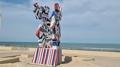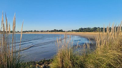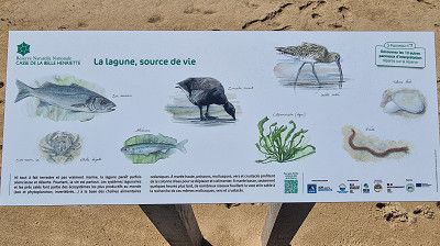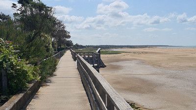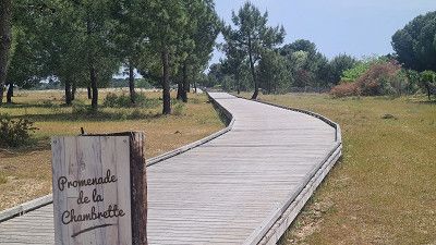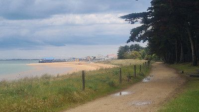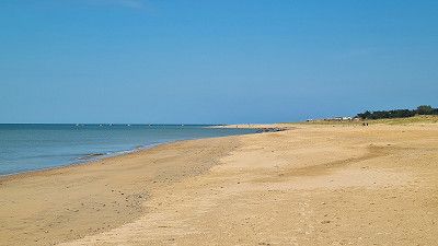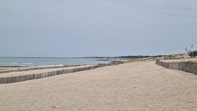 Der Plage des Amourettes. Am Nachmittag gehe ich auf einen gut zweistündigen Spaziergang. Zuerst geht es südwärts über die Plages des Bélugas, des Chardons, des Barrique bis zum Plage des Amourettes (6-7). Dort überquere ich die zwei Kilometer breite Halbinsel durch den Forêt de Longville (9-10) bis zum Delta des Flusses Lay (11). Dann folge ich dem Wanderweg auf dem Damm (12) zurück nach Faute-sur-Mer, durch die vielen Bungalows und vorbei an seiner Mairie und der Chapelle sainte Thérèse (13-15). Im gleichen Restaurant La Côte de Lumière beende ich den Spaziergang mit einem Floreffe, bevor ich mich ins Wohnmobil zurückziehe.