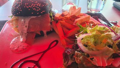 Die Kulinarik. Gegen halb zwölf Uhr endet der Regen und ich laufe den Wanderweg vom Camp nochmals nach Fromentine (1-6). Im Restaurant Le Poisson rouge bekomme ich einen Tisch auf der gedeckten Terrasse und bestelle Huîtres (vielleicht die letzten) und postmodern den Burger de la Mer (7-9). Namensgerecht leuchten hier die Gerichte im Rot des Baldachins. Die Huîtres sind ein Gedicht, der Burger mit geräuchertem Lachs naja. Dann laufe ich zurück zum Camp (10), denn dort beginne ich meine Wanderung vom Nachmittag zuerst der Küste entlang (11-15).