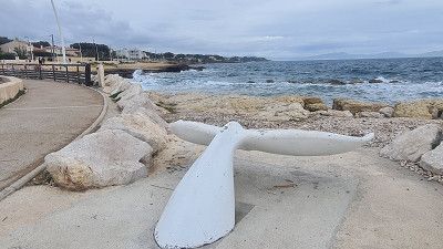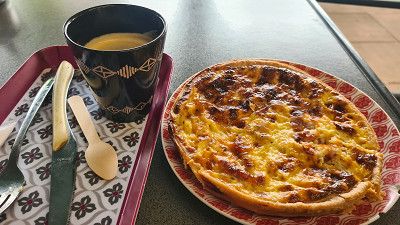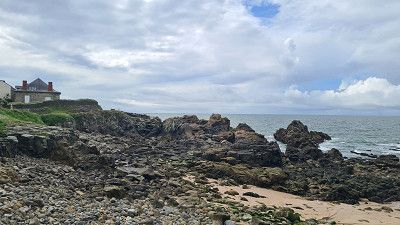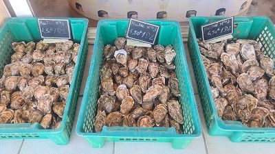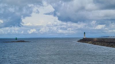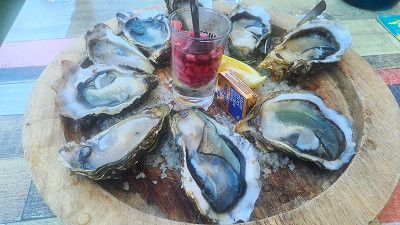 Die Kulinarik. Nach der Côte Sauvage an der Westspitze von Kervenel halte ich beim Sandkasten Le Bac à Sable (8-9) und bestelle das dreigängige Formule, heute mit der Auswahl (doch nochmals) Huîtres, Nouilles sautées aux gambas et thon frite und natürlich den kouign-amann, ich bin historisch doch schon in der Bretagne (10-12). Alles sieht nicht nur gut aus, es mundet auch ausgezeichnet. Die Austern waren sogar die bisher besten. Gestärkt setze ich mich wieder aufs eBike und fahre weiter zu kurzen Hakten beim Phare de Tréhic (13), bei der Résidence Maeva Le Croisic (14) und beim Ozeanium (15)