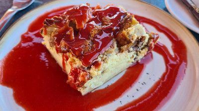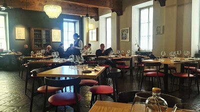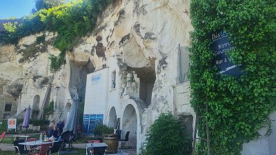 Die Kulinarik. Nach der schönen Fahrt durch die Weinberge komme ich nun bei Turquant wieder zurück zur Loire und zum Restaurant Bistroglo (1-2). Das Lokal ist natürlich im Fels beheimatet und bietet traditionelle Gerichte an: Boudin noir aux Champignon; Filet de poulet mariné; L'Eclat de Loire aver le Sorbet Mandarine (3-5); Das Verre de Vin blanc aus dem eigenen Weinberg. Ein ganz spezielles Erlebnis.