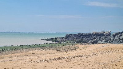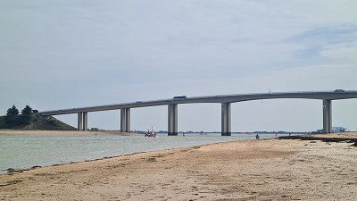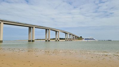 Der Spaziergang. Vom Parkplatz am Pointe L'Aiguillon (8) führt ein Fussweg von 40 Minuten über die Landzunge in der Réserve Naturelle Baie L'Aiguillon (9-15) mit schönem Blick über die Bucht von La Rochelle und in der Ferne die imposante Spannbrücke zur Île de Ré (11).