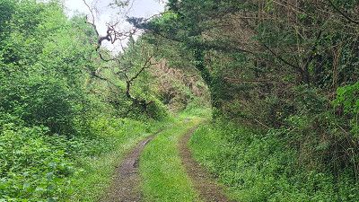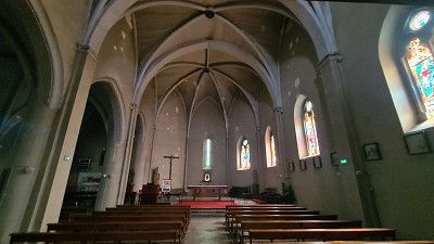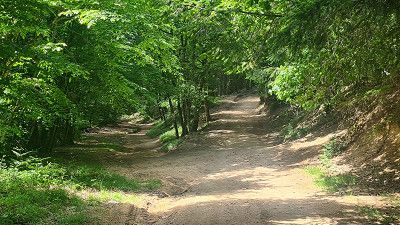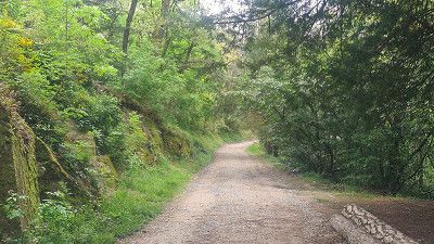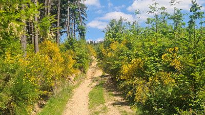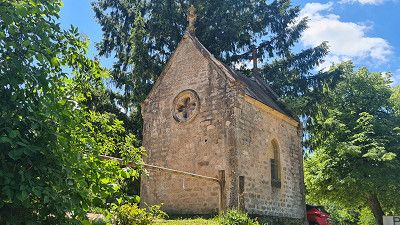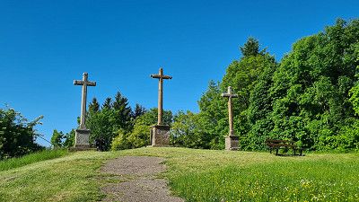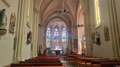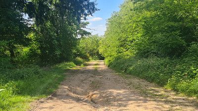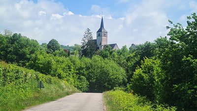 Der Spaziergang. Danach folge ich dem Hinweis für einen Sentière zur Chapelle du Chêne, der zwar schän durch den Wald, aber auf Motocross strapazierten Wegen, in einer weiten Schleife hinunter ins Tal zur Kapelle und auf der anderen Seite wieder hinauf und zurück zum Ort führt (6-13). Durch die Porte Notre-Dame (14) und die Hauptstrasse (15) erreiche ich das Zentrum und die Bar Le Montana mit seinem guten Pression d'Alsace.