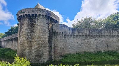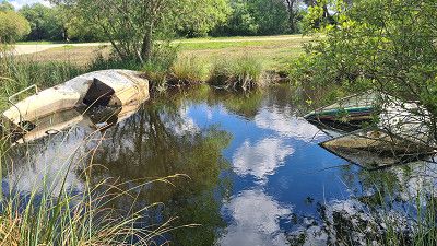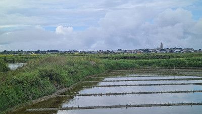 Die Salzgärten. Die Gewitter haben sich verzogen und nach dem guten Mittagessen im Le Logis beginne ich die dreistündige Wanderung über die Marais salante de Guérande (4-12). Ein schöner Weg durch eine interessante Naturlandschaft mit Seen und Feldern. Auch eine Ausstellung fehlt nicht und zeigt wertvolle Informationen über die Salzgewinnung und bietet Fleur de Sel zum Verkauf an. Über den Weiler Quénique (13) geht es dann wieder zurück nach Guérande und an der Stadtmauer (14-15) vorbei zum Camp.