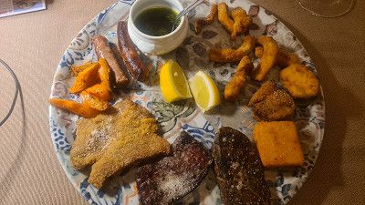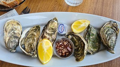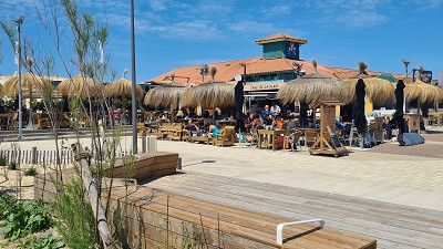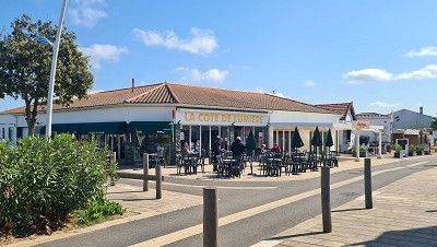 Die Kulinarik. Nach dem ersten Spaziergang suche ich das Casino des Dunes auf, das auch montags geöffnet ist, und bestelle das Formule des Dunes mit Huîtres, dem Retour de Pêche (heute Kabeljau) und einem Assiette de Fromage de Vendée (1-5). Von der Bedienung über das Essen bis zum Blick auf den Atlantik perfekt.